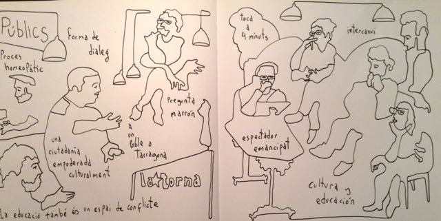 No en aquest cas. Som força estrictes amb l’horari de finalització. Ens agrada més pensar les tertúlies com quelcom que hauríem de poder fer freqüentment que com grans sessions intensives de treball que prometen arreglar-ho tot. A més, ens sembla que quan alguns espais semblen prometre o projectar un aprenentatge col·lectiu intensiu tendeixen a falsejar una realitat: en dues, tres o quatre o vuit hores de conversa entre gent que prèviament no es coneix ni té llenguatges compartits no podem arreglar-ho tot. Val més ser modestos i conscients de limitacions en aquesta ambició. Ens trobem, ens concentrem el millor que sabem, sortim confusos amb aportacions dels demés, i les digerim reposadament a casa nostra.